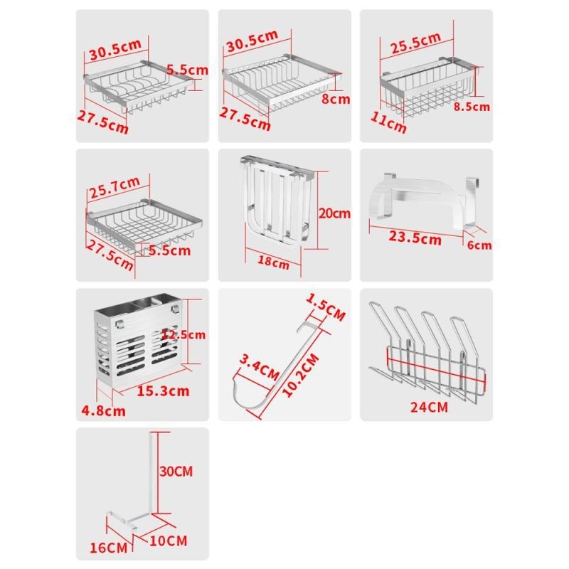| 付属品一覧 | 食器ラック、ボウルラック、包丁ラック、まな板ラック、洗剤ラック、箸ラック、カップラック、ティッシュラック、フック5個 |